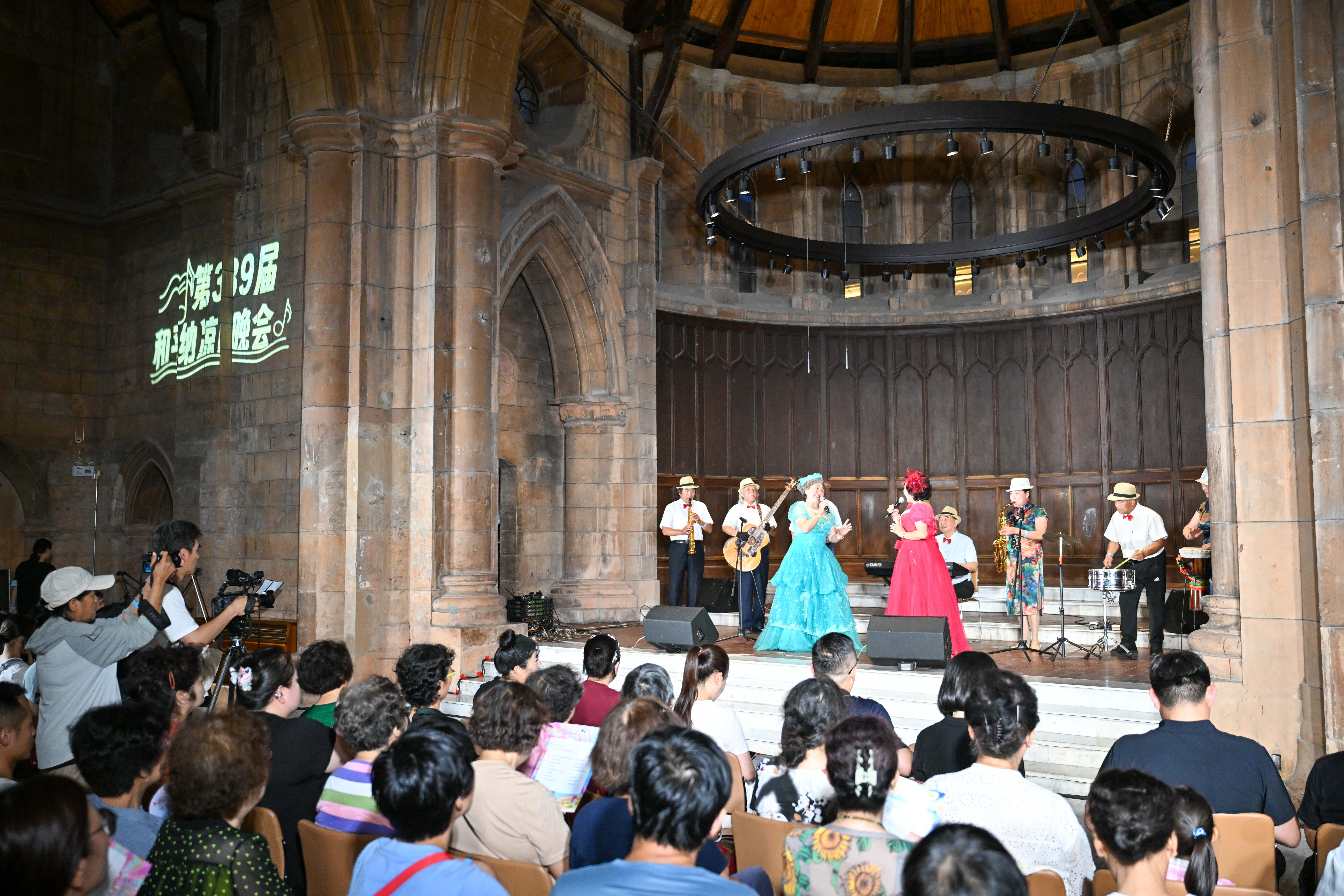 7月28日晚,在天津安里甘艺术中心,天津市和平区长春道社区居民表演俄罗斯歌曲《玛丽诺之歌》。新华社记者 孙凡越 摄